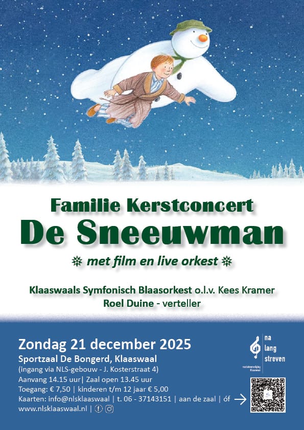 KSB, 21 december 2025 Familieconcert 'The Snowman' met verteller Roel Duine, meer info 14.15 uur, De Bongerd - Klaaswaal Meer informatie volgt!